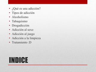 Este documento resume diferentes tipos de adicciones, incluyendo adicciones a sustancias como alcohol, tabaco y drogas, así como adicciones conductuales como el juego, el sexo y la limpieza. Explica que una adicción se caracteriza por una incapacidad de controlar una actividad compulsiva que causa problemas en la vida de una persona.