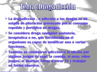 La drogadicción es una alteración causada por el consumo repetido de drogas, que pueden generar adicción no solo a sustancias, sino también a actividades como juegos y trabajo. Las razones para consumir incluyen la presión social, la curiosidad y la evasión de problemas, y se corre el riesgo de desarrollar adicción con cualquier uso de drogas. La respuesta a la drogadicción debe incluir el apoyo social y familiar, así como la intervención del gobierno para reducir el consumo y mejorar la calidad de vida de los afectados.
