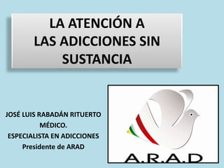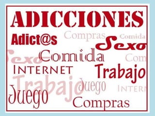 Este documento describe las adicciones sin sustancia y su tratamiento. Explica que las adicciones sin sustancia implican una relación patológica con ciertos comportamientos normales como el juego, el trabajo, el sexo, las compras y el uso de la tecnología. También describe las etapas del proceso de adicción y los factores de riesgo. Finalmente, señala que el tratamiento implica el reconocimiento del problema, el tratamiento de enfermedades asociadas y el apoyo psicológico, social y del entorno cercano