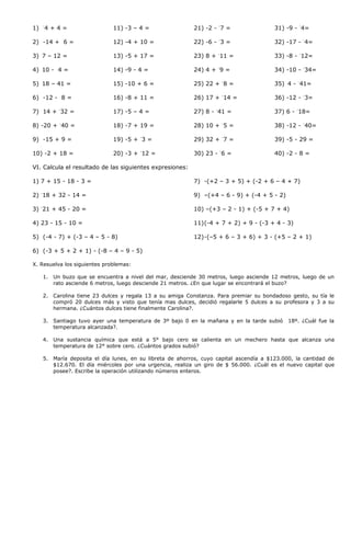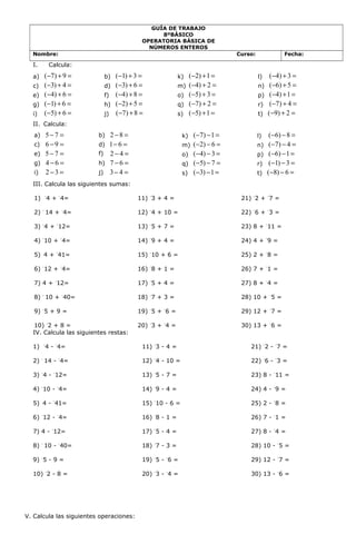 Este documento presenta una guía de trabajo con ejercicios de operaciones básicas con números enteros como sumas, restas, multiplicaciones y divisiones. Contiene 30 ejercicios de cada operación básica y también 10 problemas para resolver utilizando números enteros.