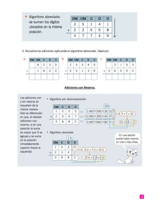 Este documento presenta instrucciones para practicar diferentes tipos de adiciones de números naturales en matemáticas de 5o grado. Incluye ejercicios para resolver adiciones usando el algoritmo de descomposición o el algoritmo abreviado, así como adiciones con reserva. Finalmente, incluye una autoevaluación para que los estudiantes evalúen su comprensión de los conceptos y habilidades de adición.