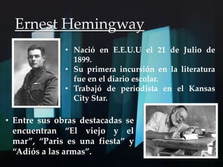 Este documento resume la novela "Adiós a las armas" de Ernest Hemingway. Se describe la vida y obra de Hemingway, se incluye una cita de la novela y se analizan temas como el carácter autobiográfico de la obra, las características de la narración y las reflexiones del protagonista Frederick Henry sobre la guerra y la vida.