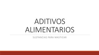 El documento describe los aditivos alimentarios y sustancias para masticar, incluyendo su procesamiento y componentes. Explica el proceso de Fischer-Tropsch para crear sustancias sintéticas y la hidrogenación parcial de la colofonia para modificar químicamente sustancias para masticar. También detalla varias gomas vegetales usadas como sustancias naturales para masticar y su purificación a través de calentamiento, centrifugación y filtrado para producir chicle.