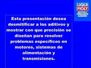 Este documento busca desmitificar los mitos sobre los aditivos para motores y mostrar sus beneficios reales. Explica que los aditivos están diseñados para resolver problemas específicos como la formación de depósitos, el desgaste excesivo, la baja presión de aceite y el humo azul. También destaca que los aditivos de la marca LIQUI MOLY han sido desarrollados con tecnología avanzada para solucionar problemas puntuales y garantizar resultados si el problema es bien diagnosticado.