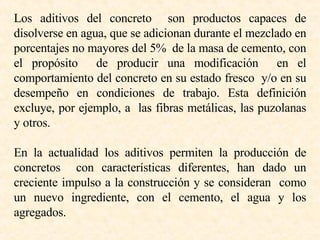 Este documento describe los diferentes tipos de aditivos químicos que se pueden agregar al concreto y sus funciones. Explica que los aditivos químicos modifican las propiedades del concreto fresco y endurecido al reducir el agua o modificar el fraguado. También resume la historia y el desarrollo de los diferentes tipos de aditivos a través de los años, incluidos los aditivos reductores de agua de alto rango y los aditivos autocompactantes.