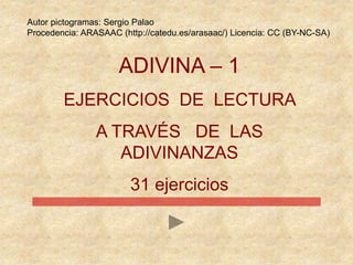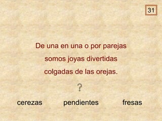 Este documento contiene 31 adivinanzas sobre diferentes objetos, animales y conceptos. Cada adivinanza consiste en una o dos oraciones que describen las características del objeto o concepto de forma enigmática para que el lector lo adivine. Las adivinanzas van desde la 1 a la 31 y cada una se presenta en una página separada con un pictograma que ilustra la respuesta.