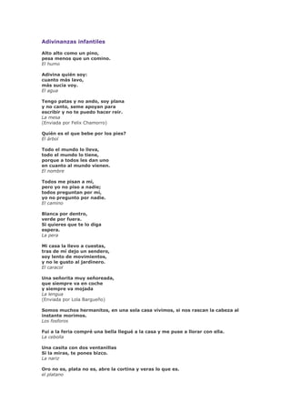 Este documento contiene 17 adivinanzas infantiles sobre diferentes objetos cotidianos como el humo, el agua, la mesa, el árbol, el nombre, el camino, la pera, el caracol, la lengua, los fósforos, la cebolla, la nariz y el plátano. Cada adivinanza describe las características del objeto de una manera enigmática en pocas oraciones para que los lectores intenten adivinar de qué se trata.