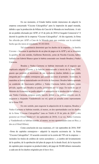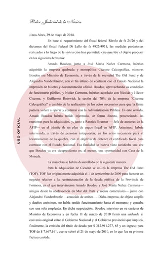 Boudou y Nuñez Carmona adquirieron la empresa quebrada Ciccone Calcográfica a través de The Old Fund con el objetivo de contratar con el Estado para imprimir billetes. Utilizaron su influencia política para obtener un plan de pagos ilegal en AFIP que levantara la quiebra, interrumpieron una licitación en Casa de la Moneda, y presionaron a otra empresa para desalojar las instalaciones de Ciccone y obtener así el control de la imprenta. Finalmente lograron que Ciccone firmara contratos con el Estado durante la