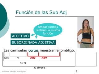 Este documento describe las subordinadas adjetivas y los pronombres relativos que las encabezan. Explica que las subordinadas adjetivas se trasponen a la función adjetiva mediante pronombres como que, quien, el cual, cuyo, donde, cuando, como o cuanto. Describe las funciones de cada pronombre relativo dentro y fuera de la subordinada, así como sus variaciones de número y género. También distingue entre subordinadas adjetivas explicativas y especificativas.