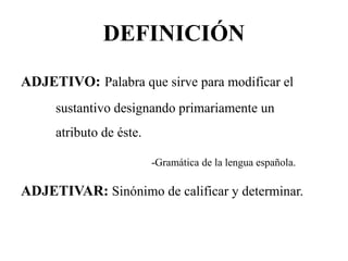 Este documento define el adjetivo y describe sus características gramaticales. Explica que los adjetivos modifican sustantivos indicando atributos y clasifican en descriptivos y no descriptivos. También describe las diferentes categorías de adjetivos como calificativos, numerales, posesivos, y más, explicando sus usos y formas. Finalmente, analiza aspectos morfológicos y de sintaxis de los adjetivos.