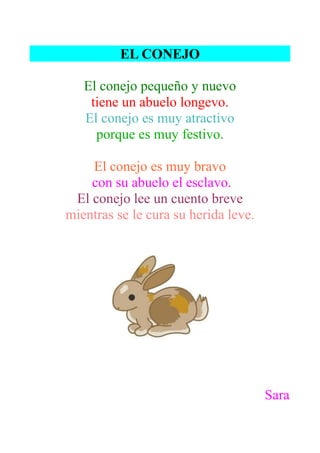 El documento contiene varios poemas cortos de diferentes autores que usan adjetivos como "nuevo", "longevo", "pensativo", "festivo", "breve", "leve", "octavo" y "esclavo" de formas variadas. Los poemas tratan sobre conejos, brujas, deportes, autos y mascotas.