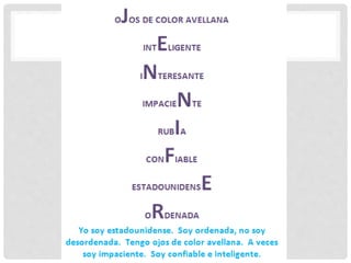 Este documento contiene información sobre una lección de español sobre adjetivos. Incluye vocabulario sobre adjetivos para describir la apariencia física y la personalidad. También presenta actividades como la creación de un poema acróstico y la descripción de personas usando adjetivos. El documento proporciona instrucciones para varias tareas como prácticas con adjetivos y la creación de un perfil de Facebook.