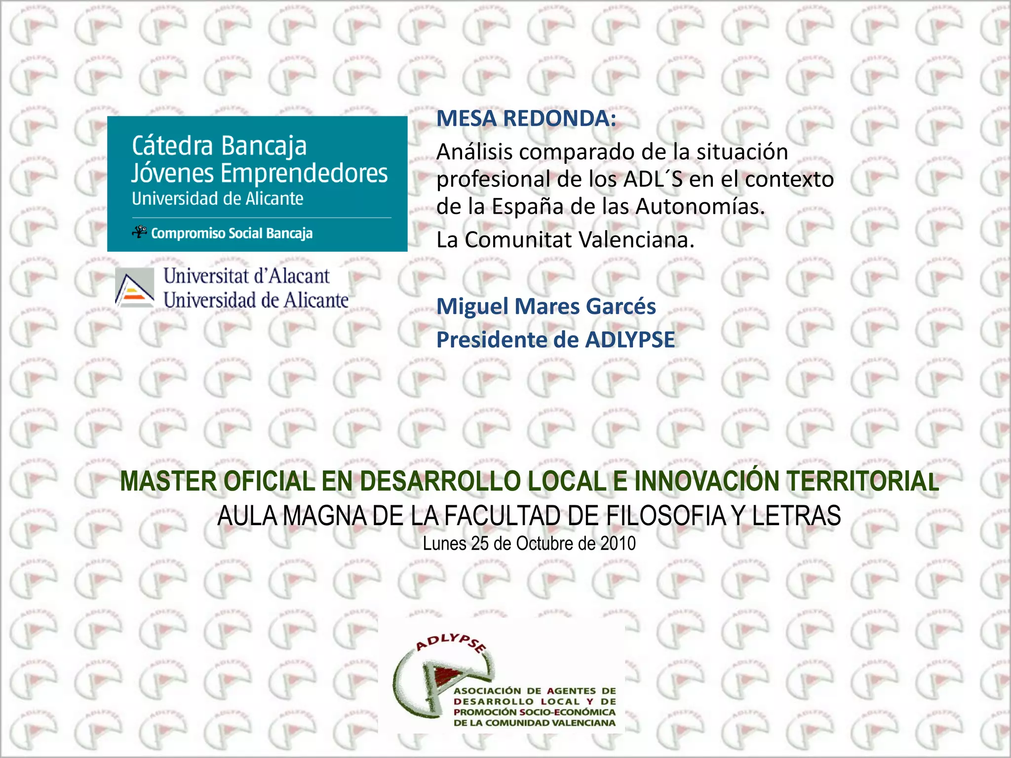Este documento resume la evolución del desarrollo local y los agentes de desarrollo local en España y la Comunidad Valenciana desde la década de 1980 hasta 2010. Incluye información sobre las subvenciones y programas de la Unión Europea y el gobierno español para apoyar a los agentes de desarrollo local y promover el empleo a nivel local. También describe la creación y objetivos de ADLYPSE, la asociación de agentes de desarrollo local de la Comunidad Valenciana.