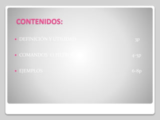 Este documento presenta un curso sobre informática y convergencia tecnológica. Explica qué es la búsqueda avanzada y cómo permite al usuario obtener resultados más específicos al realizar una consulta utilizando símbolos como filtros. Luego, detalla comandos y filtros comunes como usar @, $, #, - y entre otros para buscar en redes sociales, precios, hashtags, excluir palabras y buscar frases exactas. Finalmente, muestra cómo combinar búsquedas y buscar en sitios específicos.