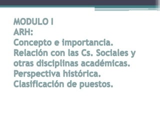 Este documento presenta una introducción a la administración de recursos humanos agropecuarios. Define la administración de recursos humanos como la organización y gestión de personas en el trabajo para desarrollar su potencial y contribuir a los objetivos de la empresa. También explora brevemente la importancia histórica del trabajo y las perspectivas científicas como la esclavitud, el feudalismo, el liberalismo y el marxismo. Concluye que la administración es tanto un arte como una ciencia que aplica el método científico para desarrollar conoc