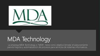 La empresa MDA Technology se fundó en 2021 con el objetivo de asesorar a otras empresas en la automatización y mejora de sus procesos de sistemas de información. Su misión es convertirse en una empresa líder que ayude a compañías sin experiencia tecnológica a crear planes sostenibles para su desarrollo digital y económico. Su visión es ofrecer consultoría de alta calidad a través de un equipo capacitado para brindar satisfacción y seguridad al cliente.