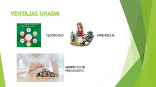 El documento describe las ventajas de estudiar en línea a través de UNADM, incluyendo la flexibilidad para elegir el grado deseado y organizar el estudio, la capacidad de aprender de manera independiente a través de la observación y comparación, y la oferta de programas de preparatoria, licenciatura y maestría sin costo. Explica que los programas están divididos en 4 módulos a lo largo de 4 años para formar profesionales calificados en administración capaces de administrar recursos de manera eficiente y satisfacer las necesidades