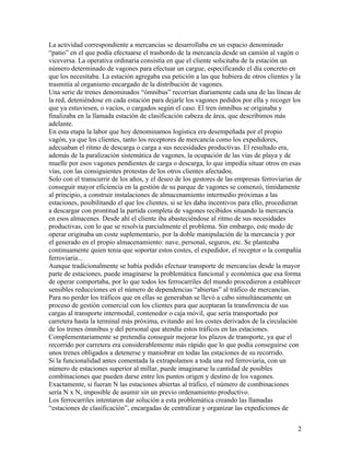 El documento describe la evolución histórica de la logística ferroviaria y las terminales de transferencia. Explica cómo las estaciones originalmente manejaban pasajeros y carga, pero con el tiempo se especializaron y se construyeron terminales de clasificación para organizar eficientemente el tráfico de mercancías a gran escala. También describe el funcionamiento de las terminales de clasificación y los procesos de formación y expedición de trenes. Por último, explica el auge reciente del transporte intermodal de contenedores y la necesidad de que el ferrocarril