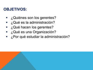 Este documento presenta una introducción a la administración. Explica que los gerentes coordinan y supervisan el trabajo de otros para lograr los objetivos de una organización. Detalla las funciones clave de los gerentes como planear, organizar, dirigir y controlar. Además, describe cómo el trabajo de los gerentes está cambiando para enfocarse más en los clientes e innovación. Finalmente, enfatiza que estudiar administración es importante debido a que la mayoría de personas dirigen o son dirigidas en el trabajo.