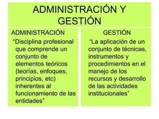 El documento presenta los conceptos básicos de administración y gestión, describiendo la administración como una disciplina profesional que comprende elementos teóricos para el funcionamiento de las entidades, y la gestión como la aplicación de técnicas y procedimientos para el manejo de recursos y actividades institucionales. También describe los procesos administrativos clave de planificación, organización, dirección y control, así como principios como la división del trabajo, autoridad y responsabilidad.