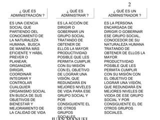 El documento trata sobre la administración básica. Explica que la administración es una ciencia social que busca de manera eficiente prever, planear, organizar, dirigir, coordinar e integrar cualquier organismo social para lograr sus objetivos. Define al administrador como la persona encargada de dirigir ese grupo social tratando de obtener la mayor productividad posible para cumplir con su misión y lograr una visión que mejore la calidad de vida. Finalmente, señala que la administración es una parte esencial de cualquier organización ya sea pequeña