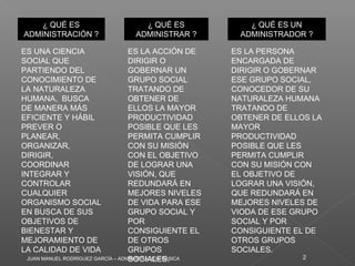 El documento presenta una introducción a la administración básica. Explica que la administración es una ciencia social que busca de manera eficiente prever, planear, organizar, dirigir, coordinar e integrar cualquier organismo social para lograr sus objetivos. También define al administrador como la persona encargada de dirigir el grupo social tratando de obtener la mayor productividad posible para cumplir con su misión y lograr una visión que mejore la calidad de vida. Finalmente, presenta un breve resumen histórico del desarrollo de la