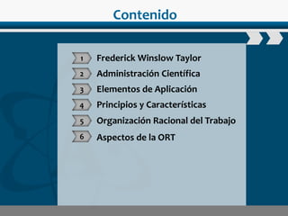 El documento describe las contribuciones de Frederick Winslow Taylor a la administración científica, incluyendo su énfasis en el uso de métodos científicos para mejorar la eficiencia y productividad mediante la estandarización de tareas y el estudio del tiempo y movimiento. Taylor abogó por la cooperación entre gerentes y trabajadores para lograr la máxima producción. Sus principios siguen siendo relevantes hoy para ayudar a las organizaciones a ser competitivas.