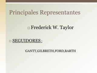 El documento describe la teoría de la administración científica de Frederick W. Taylor. Taylor propuso aplicar métodos científicos como la observación y medición a los procesos productivos para aumentar la eficiencia. Esto incluía cronometrar cada tarea, estandarizar herramientas e instrucciones, y pagar a los trabajadores en función de su productividad. Aunque aumentó la producción, su enfoque mecanicista recibió críticas por ignorar los aspectos humanos del trabajo.
