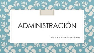La administración se refiere al proceso de prever, organizar, dirigir y controlar los recursos de una organización para alcanzar objetivos predeterminados. El término proviene del latín "administratio" y fue definido por varios autores como la coordinación de energías sociales para lograr una actividad común o la dirección de un organismo para alcanzar sus metas. La administración se caracteriza por ser universal, específica, tener una unidad temporal y jerárquica. Personajes clave en el desarrollo de la administración incluyen a Frederick
