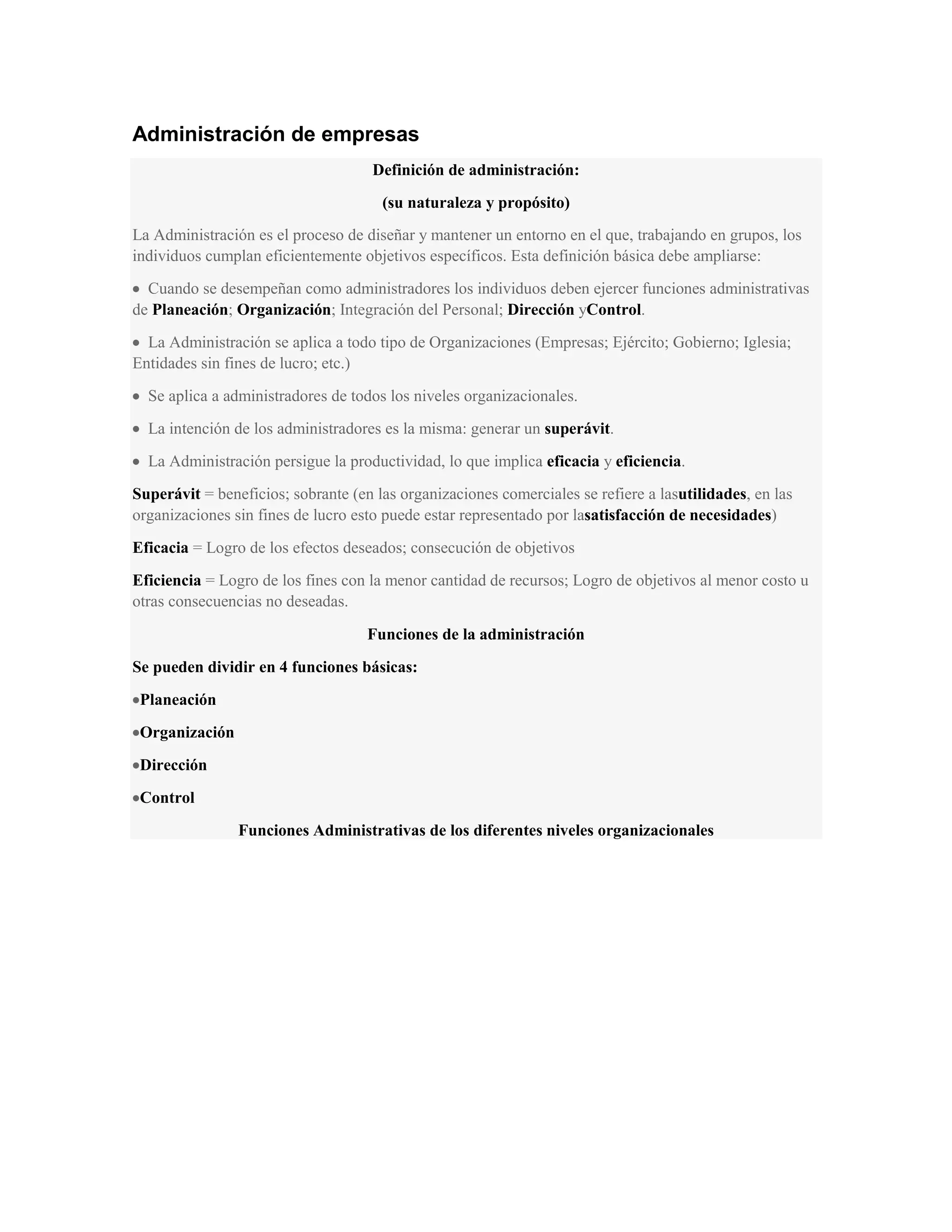 Este documento define la administración como el proceso de diseñar y mantener un entorno donde los individuos trabajan en grupo para cumplir objetivos de manera eficiente. Explora las funciones de la administración como la planeación, organización, dirección y control. También discute las habilidades necesarias para los administradores y las metas comunes de todas las organizaciones de generar superávit a través de la productividad y eficiencia. Finalmente, analiza las variables del ambiente externo e interno que afectan a las organizaciones.
