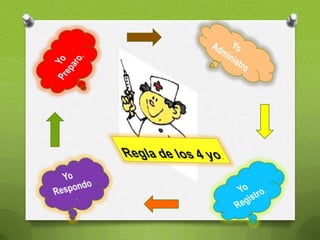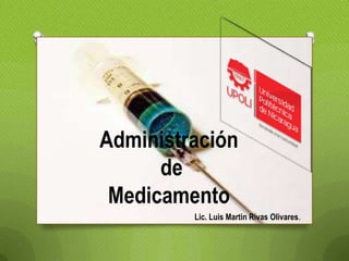 Este documento describe los principios básicos de la administración de medicamentos por parte de enfermeras. Explica que la administración de medicamentos debe realizarse siguiendo las prescripciones médicas y los conocimientos sobre factores fisiológicos, mecanismos de acción de las drogas y vías de administración. También cubre conceptos como objetivos de la administración de medicamentos, efectos deseados versus efectos secundarios, equipos utilizados y recomendaciones generales para asegurar la seguridad del paciente.