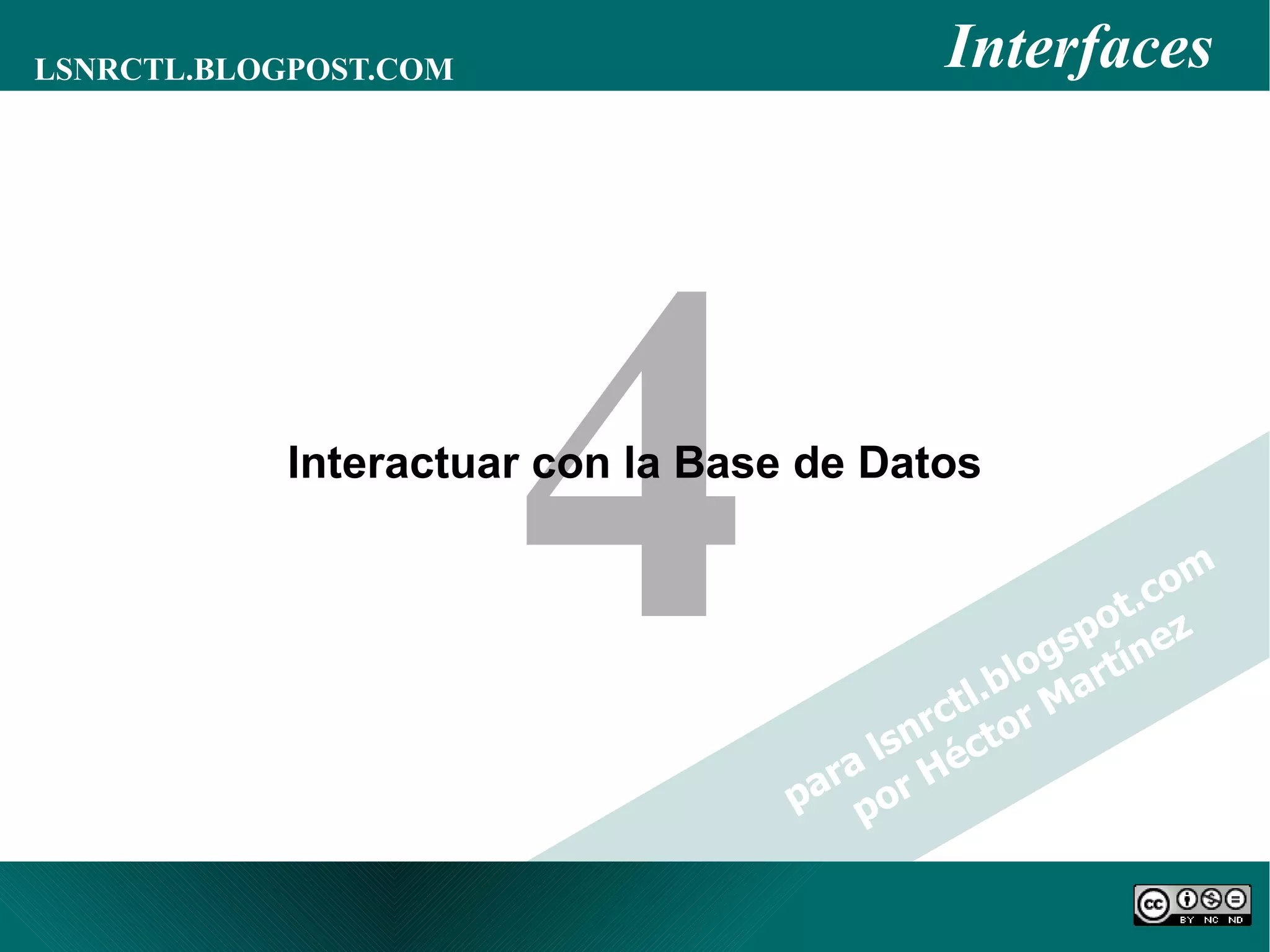 El documento explica cómo interactuar con bases de datos Oracle 10g utilizando herramientas como sql*plus e isql*plus, y detalla la importancia de SQL para la consulta y manipulación de datos a través de sus lenguajes DDL, DCL y DML. Se describen sentencias específicas para añadir, modificar y eliminar datos, así como la gestión de transacciones y bloqueos para asegurar la integridad de los datos. Además, introduce PL/SQL como una extensión de SQL para programación más avanzada en la base de datos.