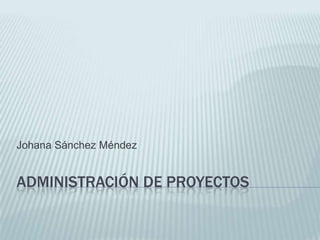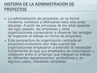 Este documento trata sobre la historia y conceptos básicos de la administración de proyectos. Explica que la administración de proyectos moderna comenzó a desarrollarse en la década de 1960 y que involucra el equilibrio entre el tiempo, costo y alcance de un proyecto. También describe herramientas como el diagrama de Gantt y las diferentes etapas de un proyecto, incluida la idea, diseño, ejecución y evaluación.