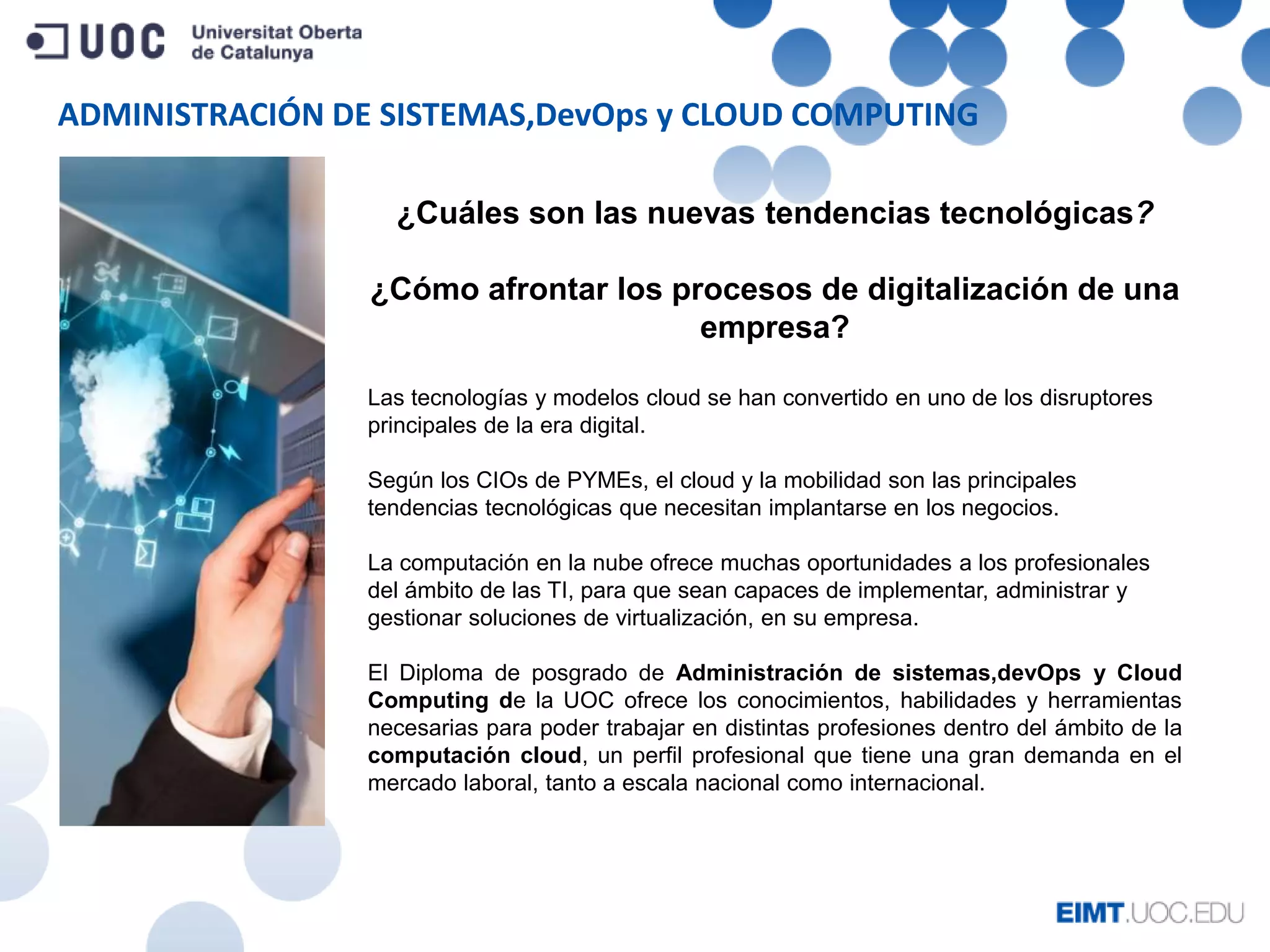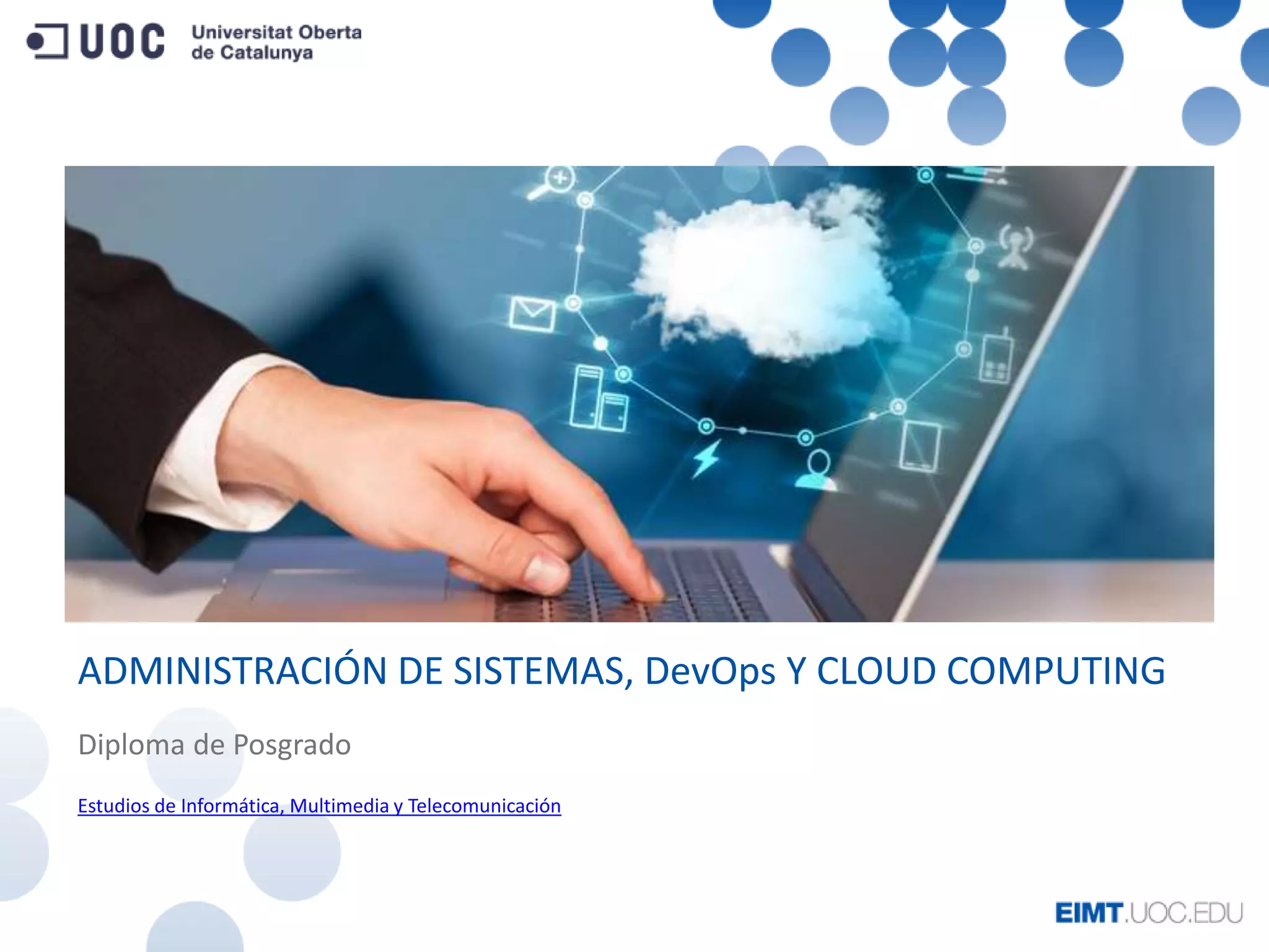 Este documento describe un diploma de posgrado en Administración de Sistemas, DevOps y Cloud Computing impartido por la UOC. El programa ofrece conocimientos, habilidades y herramientas para trabajar en profesiones relacionadas con la computación en la nube, un área en expansión con gran demanda. Los estudiantes aprenderán a administrar sistemas abiertos, virtualización y contenedores, arquitecturas cloud, y a diseñar soluciones cloud privadas, híbridas y públicas. El programa está dirigido a profesionales TI y otros
