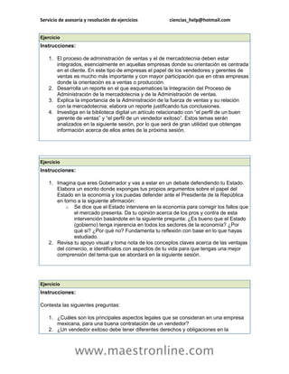 Este documento presenta información sobre un servicio de asesoría y resolución de ejercicios en ciencias. Proporciona los correos de contacto y la página web del servicio. Además, incluye varios ejercicios sobre temas de administración de ventas, marketing, economía, derecho laboral y gestión de fuerza de ventas para que sean resueltos.