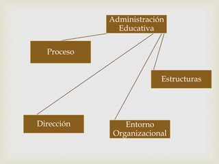 Este documento presenta las dimensiones de la administración educativa según diferentes autores. Describe las dimensiones administrativa financiera, organizativa operacional y pedagógica curricular. Explica que la administración educativa tiene como finalidad utilizar los recursos y lograr las metas de la educación, sin perder de vista su objetivo principal.