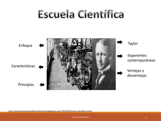 El documento presenta una descripción general de la Escuela Científica de Administración. Detalla los principales exponentes de esta escuela como Taylor, Gantt, Gilbreth, Towne, Emerson y Ford, y resume sus principales aportes para mejorar la eficiencia industrial a través de métodos científicos como el estudio de tiempos y movimientos. También resume las ventajas y desventajas de esta teoría de administración.