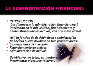 Este documento presenta una introducción a las finanzas y la administración financiera, dividiendo las decisiones financieras en tres áreas: inversiones, financiamiento de activos y administración de activos. Explica que la función principal de las finanzas es obtener fondos y dirigirlos a proyectos que aumenten el valor de la empresa. También describe los objetivos generales y específicos de un curso sobre finanzas.