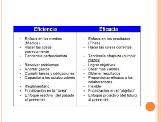 El documento presenta una introducción a los conceptos fundamentales de la administración. Define la administración como un proceso social que busca lograr objetivos institucionales mediante la coordinación de recursos humanos. Explica que el proceso administrativo consta de cuatro funciones principales: planeación, organización, dirección y control. Finalmente, distingue los conceptos de eficacia, como la capacidad de lograr un efecto deseado, y eficiencia, como lograr ese efecto con los menores recursos posibles.
