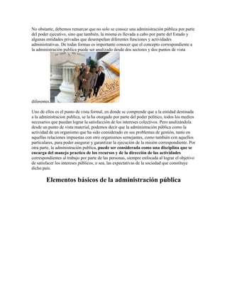 La administración pública comprende las organizaciones públicas que realizan funciones administrativas y de gestión para el Estado y otros entes públicos. Su función principal es crear un vínculo entre el poder político y la ciudadanía, satisfaciendo intereses públicos de forma inmediata. La administración pública se encuentra principalmente en el poder ejecutivo y organismos vinculados a él, aunque algunas dependencias de otros poderes también pueden formar parte.