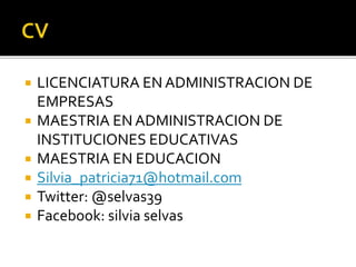 El documento presenta la información profesional y académica de la Mtra. Silvia Patricia Selvas Pérez. Posee una licenciatura en Administración de Empresas, una maestría en Administración de Instituciones Educativas y otra en Educación. Ofrece sus servicios de consultoría para el manejo óptimo de organizaciones y el logro de objetivos organizacionales de manera efectiva.