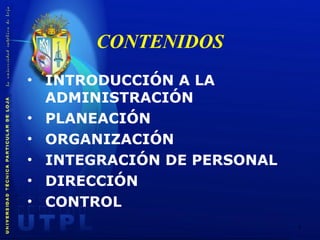 El documento aborda los fundamentos de la administración, incluyendo funciones como planeación, organización, integración de personal, dirección y control. Se enfatiza la importancia de la planificación estratégica y la adaptación de la estructura organizacional para alcanzar los objetivos eficientemente, destacando roles clave y habilidades necesarias en los administradores. También se menciona el contexto legal y normativo dentro de la administración pública en Ecuador, subrayando la necesidad de transparencia y eficacia en la gestión pública.