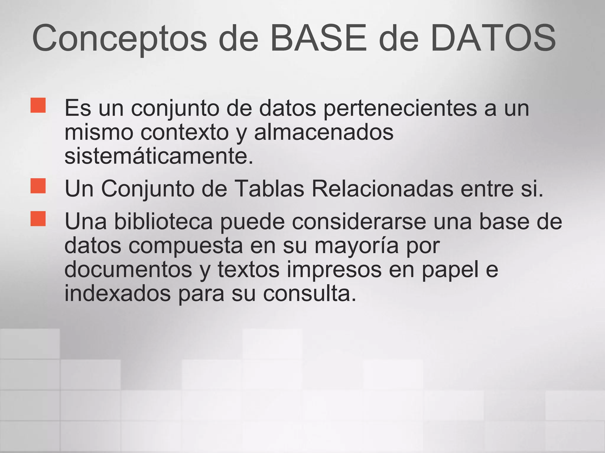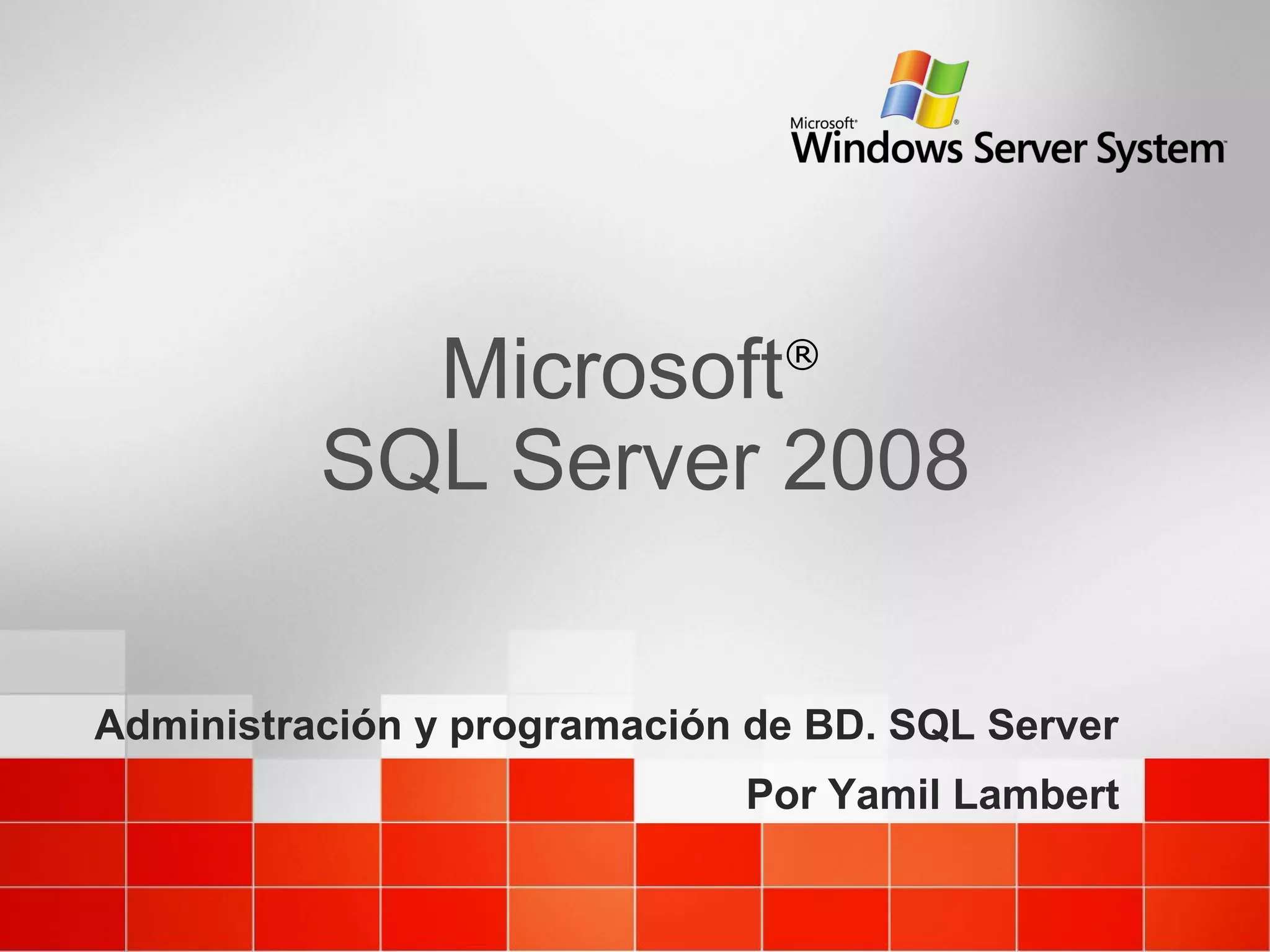 Este documento describe conceptos básicos de bases de datos, incluyendo tipos de bases de datos, modelos de bases de datos como jerárquicas, en red y relacionales, las tablas, claves primarias y foráneas, el modelo entidad-relación, integridad de datos y el lenguaje SQL. También cubre Microsoft SQL Server 2008, incluyendo versiones, licencias, instalación, administración de bases de datos y esquemas.
