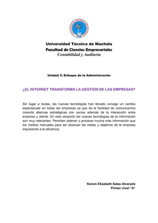 El documento discute cómo el Internet ha transformado la gestión de las empresas al facilitar la comunicación y creación de alianzas estratégicas entre empresas y clientes, y permitir que las empresas obtengan y procesen más información que los métodos manuales para lograr sus objetivos y metas de una manera más eficiente.