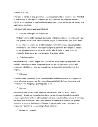 La administración busca obtener resultados de máxima eficiencia mediante la coordinación de personas, cosas y sistemas de una organización. Un buen administrador analiza e investiga a los trabajadores, fomenta el trabajo en equipo, demuestra liderazgo, carisma, motivación y empatía, es creativo, adaptable, y tiene visión de futuro. Las funciones administrativas incluyen planeación, organización, dirección, coordinación y control, las cuales se distribuyen jerárquicamente en la empresa. La administración estratégica evalúa sistem