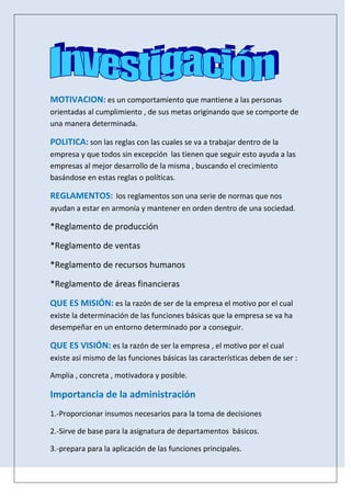 El documento define conceptos clave de la administración como motivación, política, reglamentos, misión, visión e importancia de la administración. Explica que la motivación mantiene a las personas orientadas al cumplimiento de metas, las políticas son las reglas de una empresa, y los reglamentos son normas que mantienen el orden. Define la misión como la razón de ser de una empresa y la visión como su razón de ser y funciones a largo plazo. Resalta la importancia de la administración para la toma de decisiones y logro de objetivos organiz