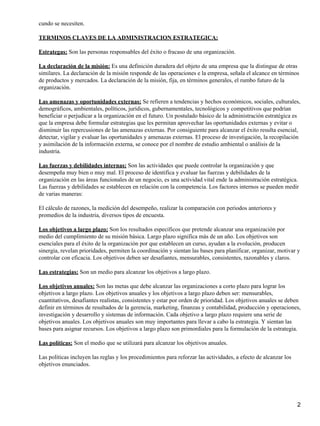 La administración estratégica involucra la formulación, implementación y evaluación de decisiones a largo plazo para lograr los objetivos de una organización. Incluye tres etapas: 1) formulación de la estrategia mediante el establecimiento de la misión, identificación de oportunidades y amenazas externas, y fuerzas y debilidades internas; 2) implementación de la estrategia a través de objetivos anuales, políticas y asignación de recursos; y 3) evaluación de la estrategia midiendo el desempeño y realizando