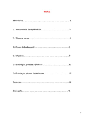 Este documento presenta información sobre la planeación administrativa. Explica los fundamentos, tipos de planes, pasos de la planeación, objetivos, estrategias, políticas y premisas. También describe las estrategias y la toma de decisiones. La planeación es el proceso de establecer metas y elegir medios para alcanzarlas. Incluye identificar la misión, realizar diagnósticos, determinar alternativas estratégicas, seleccionar estrategias específicas y la misión operativa. La toma de decisiones implica seleccionar