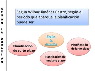 El documento describe los diferentes tipos de planificación según su duración: planificación a largo plazo (2-5 años), mediano plazo (1 año) y corto plazo (trimestrales). También detalla las ventajas de la planificación como proporcionar orden y propósito, identificar cambios futuros, y proveer una base para el control. Por último, reconoce las limitaciones y desventajas de la planificación como su imprecisión ante resultados imprevistos y que puede retrasar acciones.