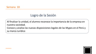 El documento proporciona información sobre la constitución de empresas en Perú. Define emprendedor, empresa y tipos de empresas. Explica las características de las micro y pequeñas empresas (Mypes) según la Ley Mype, incluyendo los derechos laborales que reconoce. También resume los pasos para constituir legalmente una empresa en Perú.